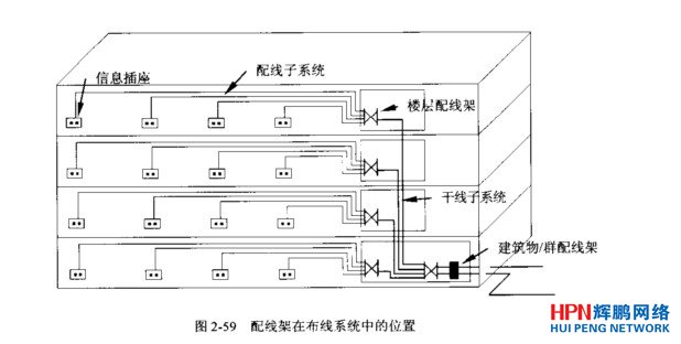 根據(jù)配線架所在位置的不同,可將其分為主配線架和中間配線架,前者用于建筑物或建筑群的配線,而后者用于樓層的配線。水平子系統(tǒng)的一端為信息插座,另一端為中間配線架。垂直子系統(tǒng)的一端為中間配線架,另一端為主配線架,或者兩端均為集線設(shè)備。如所示為配線架在綜合布線系統(tǒng)中的具體位置。