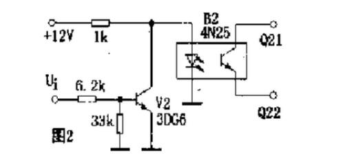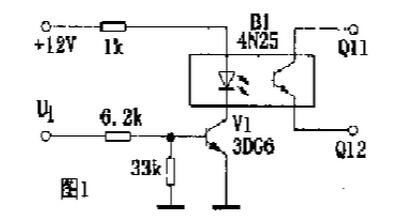 圖1電路中,當(dāng)輸入信號(hào)ui為低電平時(shí),晶體管V1處于截止?fàn)顟B(tài),光電耦合器B1中發(fā)光二極管的電流近似為零,輸出端Q11、Q12間的電阻很大,相當(dāng)于開(kāi)關(guān)“斷開(kāi)”;當(dāng)ui為高電平時(shí),v1導(dǎo)通,B1中發(fā)光二極管發(fā)光,Q11、Q12間的電阻變小,相當(dāng)于開(kāi)關(guān)“接通”.該電路因Ui為低電平時(shí),開(kāi)關(guān)不通,故為高電平導(dǎo)通狀態(tài).同理,圖2電路中,因無(wú)信號(hào)(Ui為低電平)時(shí),開(kāi)關(guān)導(dǎo)通,故為低電平導(dǎo)通狀態(tài).