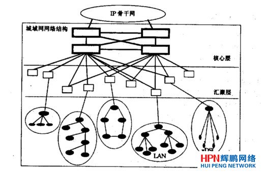寬帶城域網(wǎng)是一種比較新的網(wǎng)絡(luò)技術(shù),它的大小通常要覆蓋一個地區(qū)或城市,在地理范圍上從幾十千米到上百千米,又稱為區(qū)域網(wǎng)。它對硬件和軟件的要求比局域網(wǎng)要高,這樣才能有效地覆蓋更大的地域范圍,無論網(wǎng)點設(shè)在何處,都能保證信息共享。寬帶城域網(wǎng)的設(shè)計一般采用分層結(jié)構(gòu),這樣建網(wǎng)可以使網(wǎng)絡(luò)結(jié)構(gòu)清晰,各層的功能實體之間作用定位清楚,接口開放、標(biāo)準(zhǔn)。根據(jù)網(wǎng)絡(luò)的不同規(guī)模,寬帶城域網(wǎng)一般分為核心層、匯聚層和接入層,如下圖所示。