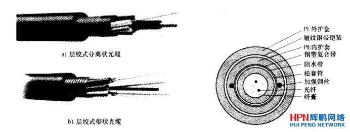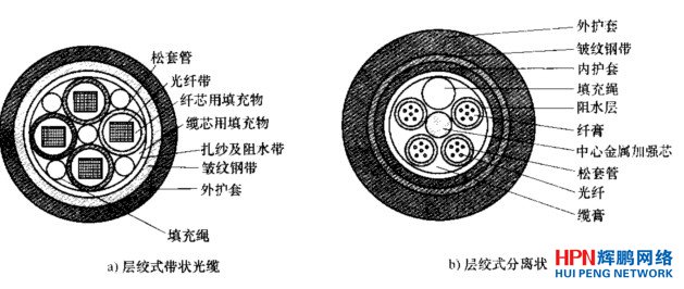 室外光纜的基本結(jié)構(gòu)有層絞式、中心管式、骨架式。每種基本結(jié)構(gòu)中既可放置分離光纖,亦可放置帶狀光纖。其特點(diǎn)分述如下:松套管,無絞合直接放在纜的中心位置,縱包阻水帶和雙面涂塑鋼(鋁)帶,兩根平行加強(qiáng)圓磷化碳鋼絲或玻璃鋼圓棒位于聚乙烯護(hù)層中。按松套管中放入的是分離光纖、光纖束還是光纖帶,中心管式光纜分為分離光纖的中心管式光纜或光纖帶中心管式光纜等。